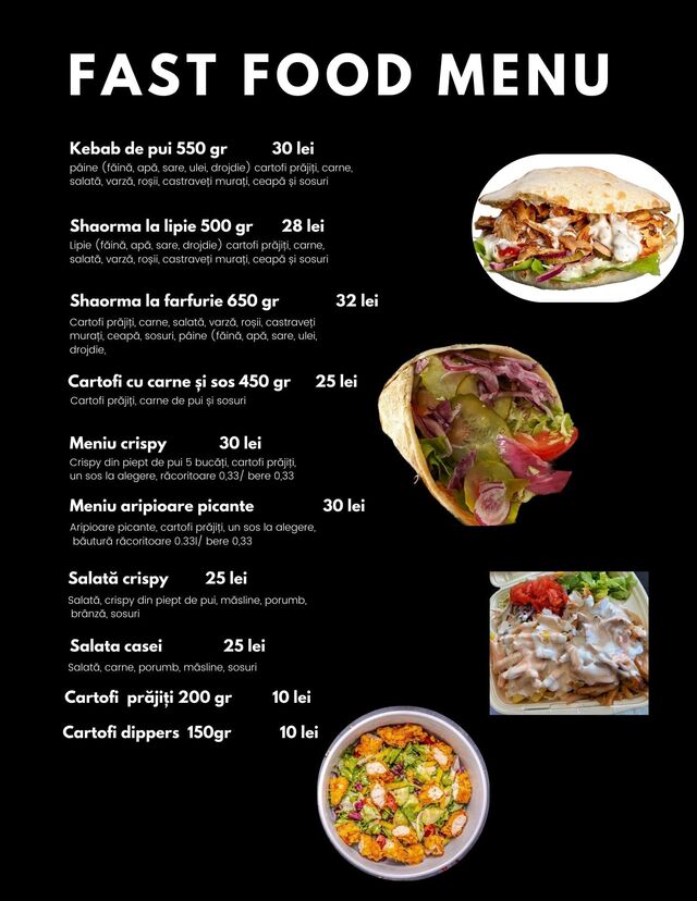 La Hot Fast Food din Sânmartin, Oradea, poți savura o shaorma delicioasă, preparată cu ingrediente proaspete și carne bine condimentată. Fie că alegi varianta de pui sau vită, fiecare shaorma este îmbogățită cu sosuri aromate și legume crocante, oferindu-ți un gust autentic și sățios. Perfectă pentru o masă rapidă și gustoasă, shaorma de la Hot Fast Food este apreciată de localnici pentru porțiile generoase și combinația echilibrată de arome.